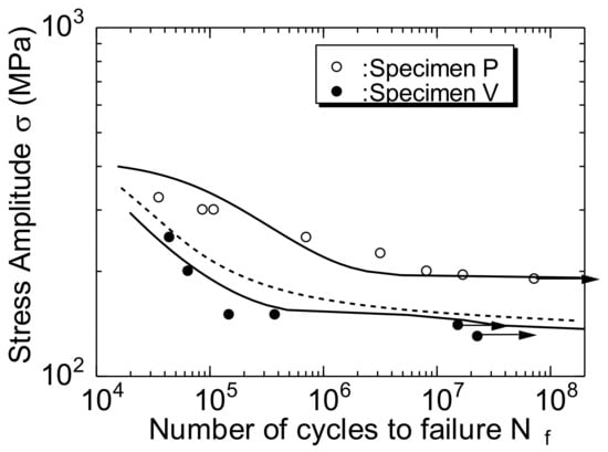 The two curves shown by the solid lines in Figure 12 are the S–N curves calculated for specimens P and V using Equation (10). As presented in the figure, the calculation results and experimental data indicated good agreement.