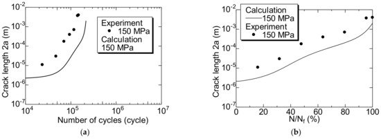 Next, the FCG behavior of specimen V was observed. Figure 8a,b show the relationship between 2a–N and 2a–N/Nf of specimen V, respectively. In specimen V, the length of the test section was short, which resulted in a difficult experiment. Therefore, the FCG behavior could only be measured with a σa value of 150 MPa.