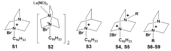 Structures of quaternary ammonium derivatives of quinuclidine (S3) and of DABCO derivatives (S1, S2, and S4 to S9 surfactants). Figure adapted from [121].
