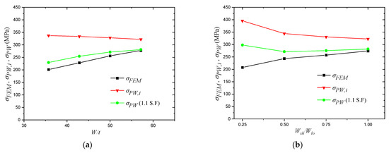 Figure 21a shows the influence of the long plate width to thickness ratio on the weld stress obtained by the FEM and Equation (20). For this figure, N/mm, , mm, mm, mm, MPa and MPa.