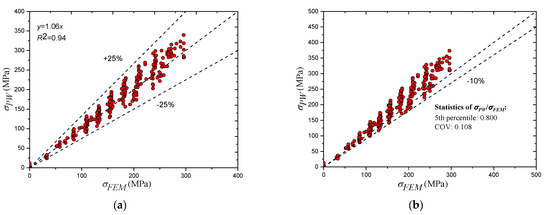 The fitting of the equation results with the FEM results is based on Equation (24), and after trying several functions, the best results were obtained using a second-degree polynomial. The final formula to calculate the stress at the partial penetration welded corner is presented in Equation (25). The results of Equation (25) are plotted against the FEM results for a large number of points considering the range of parameters reported in Table 6, as shown in Figure 23a. It is worth mentioning that since the intention of the proposed equation was to yield a lower bound solution for most of the cases, some calculation points were excluded while performing the regression analysis. The reason behind excluding these points is because of the influence they had on the final equation, causing it to yield unacceptable underestimations for other points. However, excluding these points had no influence on the capability of the equation to yield a lower bound solution, as it only caused these points to be positioned higher than the +25% threshold shown in Figure 23a. An example of such points is when the short plate to long plate ratio is very small, namely, ; the overestimation of this case, which is the maximum calculated, is 43.6%.