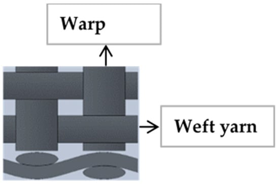 The fabric woven from high-tenacity polyester and polyamide 66 yarns in the warp and weft direction respectively were supplied from Kordárna Plus a.s. company, Velká nad Veličkou, Czech Republic. This type of fabric is known with an acronym of EP fabric in the conveyor belt manufacturing industries. The fabrics were woven with a plain weave structure. Plain weave is the simplest type of woven fabric structure with an interlacement of warp and weft yarns at the right angle to each other, as shown in Figure 1. Plain weave and its derivates are mainly used to reinforce conveyor belts [22]. Ninety percent of technical fabrics are produced by a plain weave because of its maximum number of binding points and relatively high fabric strength compared to other weave structures [24].