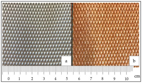 The woven fabrics were supplied by a manufacturer in a greige and dipped form. The greige woven fabrics are fabrics without any finishing treatments, as shown in Figure 2a. The adhesion between the textile reinforcement (carcass) and rubber matrix is necessary to obtain the desired properties of the conveyor belt. However, EP fabrics have no sufficient adhesion property to the rubber material. Therefore, to enhance the adhesiveness of woven fabrics to the rubber, the fabrics were impregnated with a resorcinol–formaldehyde–latex (RFL) solution. The fabric sample dipped in the RFL solution is referred to as dipped woven fabric in this article; the image of the dipped fabric is shown in Figure 2b. The properties of the dipped woven fabric sample used for this study are provided in Table 1.
