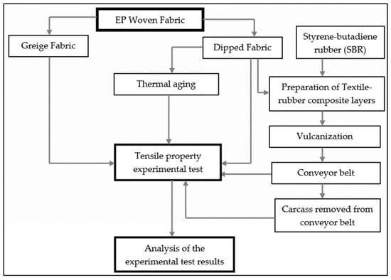 Additionally, the woven fabric layers were removed from the conveyor belts, and the tensile strength of these fabrics were also investigated. In addition, the effect of the dipping process of fabric in the resorcinol–formaldehyde–latex (RFL) on the tensile strength and elongation of the woven fabric was studied. The experimental test results at each stage of the process were analyzed to understand the effect of temperature and duration of the vulcanization process on the tensile property of the textile carcass of the conveyor belt. The experimental processes implemented in this work are shown in Figure 3. Moreover, the detailed processes and parameters utilized to fulfill these approaches are also presented in the following sections.