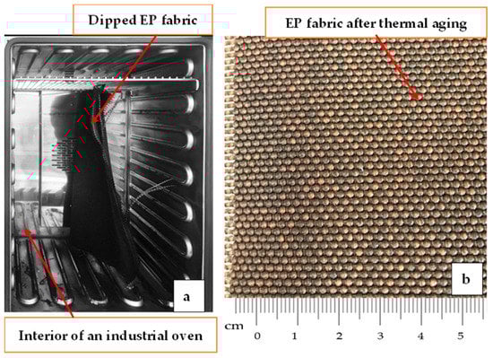 (a) An industrial oven for a thermal aging of fabric; (b) EP fabric sample aged at 220 °C for 6 min.