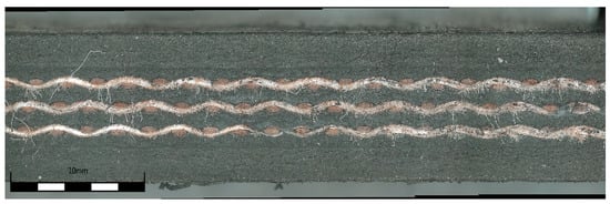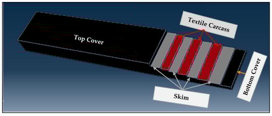 A styrene–butadiene rubber (SBR) was used for the top and bottom covers of the belt. Additionally, SBR synthetic rubber was also utilized as the skim part of the conveyor belt to adhere the plies of the reinforcement. The three-dimensional model of the textile-reinforced conveyor belt is shown in Figure 5. All conveyor belt samples were prepared based on the presented model at different vulcanization conditions. For example, the side view of a textile-reinforced conveyor belt made at vulcanization conditions of 160 °C for 35 min is shown in Figure 6.