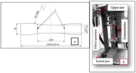 - ISO. Textiles—Tensile Properties of Fabrics—Part 1: Determination of Maximum Force and Elongation at Maximum Force Using the Strip Method; ISO 13934-1:2013; ISO: Geneva, Switzerland, 2013. [Google Scholar]