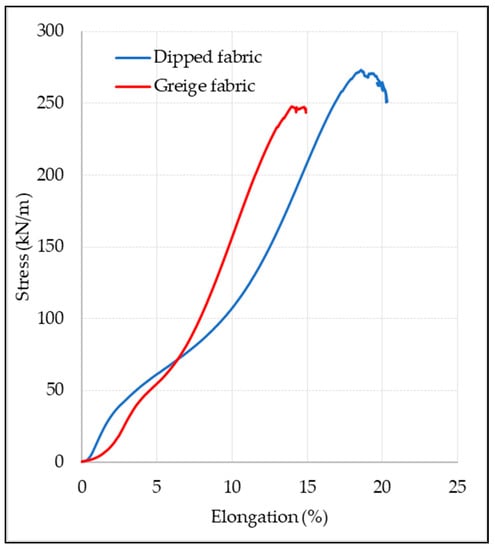 Stress-percentage elongation curve of EP200 greige and dipped fabric samples.