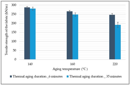 The impact of thermal aging temperature and duration of aging on the tensile properties of EP woven fabrics intended to be used as a carcass of the textile-reinforced conveyor belt were investigated. The tensile strength of thermally aged woven fabrics along with the respective aging temperature and duration of aging are shown in Figure 9. The results revealed that the increases in aging temperature decreased the tensile strength of the fabric regardless of aging duration.