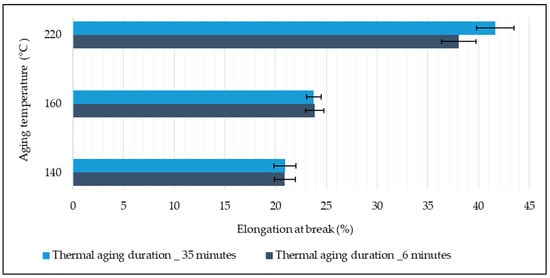 The influence of thermal aging on the percentage elongation at break of the EP woven fabrics is shown in Figure 10. The results show that the aging temperature highly impacted the elongation property of the woven fabric for the fabric samples that underwent thermal aging above the glass transition temperature of the polyester fiber. There were no significant changes observed in the percentage elongation at break of fabric samples aged at 140 °C and 160 °C because of the variation of aging duration. However, the fabric samples that underwent thermal aging at 220 °C have shown an 8.59% increase in percentage elongation as the aging time increased from 6 to 35 min. The increment of aging temperature from 140 to 220 °C increased the elongation of the fabric irrespective of aging duration. The highest percentage elongation at break was registered for the samples aged at 220 °C for longer aging time (35 min), which is 49.78% higher than the samples aged at 140 °C.