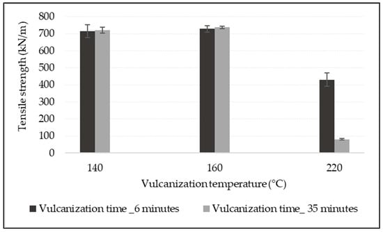 The carcass of the conveyor belt is the backbone of the belt in determining the tensile property of the belt. The influence of vulcanization temperature and time on the conveyor belt’s tensile strength has been investigated. A multi-layer conveyor belt reinforced with a textile fabric of EP 200N has been vulcanized under three different vulcanization temperatures for six and thirty-five minutes of vulcanization time, while the other vulcanizing parameters were constant. As shown in Figure 11, it is clear that vulcanizing EP fabric-reinforced conveyor belt at high temperatures has extremely affected the tensile property of the belt. The tensile strength investigation results indicate that vulcanizing EP fabric-reinforced conveyor belts at the temperature of 140 °C and 160 °C regardless of vulcanizing time used in this experiment have not shown any considerable tensile strength difference. However, the tensile strength of the conveyor belt vulcanized at 220 °C for 35 min was almost destroyed. Compared to the conveyor belt sample vulcanized at 160 °C, the tensile strength of the samples vulcanized at 220 °C for 35 min has been reduced by 89.06%. In addition to that, the tensile strength of samples vulcanized at 220 °C for 6 min was also reduced by 40.16% compared to conveyor belt vulcanized at 160 °C for 6 min. These results show that the vulcanization of EP fabric-reinforced conveyor belt at high temperature deteriorates the tensile strength of the conveyor belt regardless of vulcanization time; this shows that vulcanizing of the EP-reinforced conveyor belt above the glass transition of the polyester and polyamide 66 fibers can fully deteriorate the tensile property of the belt.