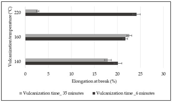 The experimental test results show that the vulcanization temperature and time have an impact on determining the elongation property of a conveyor belt. As shown in Figure 12, the percentage elongation of a conveyor belt vulcanized for six minutes increased with vulcanizing temperature. In addition, the highest percentage elongation of the belt was observed for the sample vulcanized at high temperature (220 °C) for the shortest vulcanizing time (6 min), which was 20.02% higher than the conveyor belt sample vulcanized at 140 °C for 6 min. In contrast, the lowest percentage elongation of the conveyor belt was obtained for the samples vulcanized at 220 °C for thirty-five minutes of vulcanizing time, and this result was 84.95% lower than the samples vulcanized at 140 °C. The carcass of the conveyor belt vulcanized at 220 °C for 35 min was nearly destroyed, and the sample had no ability to withstand the stress imposed on the sample; this was the main reason for the droppage of the percentage elongation and tensile strength of the conveyor belt. Even though lower elongation of the conveyor belt was achieved at the vulcanization condition of 220 °C for 35 min, this cannot be considered as an optimum vulcanization temperature for the conveyor belt design due to its low tensile strength.