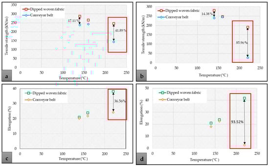 Comparison of tensile strength of thermally aged woven fabric with single ply of the conveyor belt’s carcass. (a) Tensile strength of dipped woven fabric and conveyor belt that underwent thermal aging for 6 min; (b) Tensile strength of dipped woven fabric and conveyor belt that underwent thermal aging for 35 min; (c) Percentage elongation of dipped woven fabric and conveyor belt that underwent thermal aging for 6 min; (d) Percentage elongation of dipped woven fabric and conveyor belt that underwent thermal aging for 35 min.