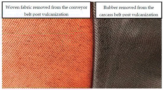 The effect of vulcanization temperature and duration of vulcanization process on the tensile property of the conveyor belt’s carcass was compared with the tensile property results of dipped woven fabric aged in the electric oven. The influence of processing parameters on the tensile strength and percentage elongation of the woven fabrics are shown in Figure 13a–d. As mentioned in the previous sections, the conveyor belts with three layers of EP 200 woven fabric were produced. However, to compare the tensile property difference of the fabric thermally aged in the oven with the tensile property of fabric vulcanized with the rubber, the carcass part of the conveyor belt was removed from the reinforcement, as shown in Figure 14.