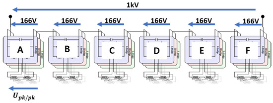 In order to show how the innovative design approach proposed here works and how this interlaces with the selection of insulating materials, a case based on a recent DOE ARPA-E project, ASCEND, is dealt with here. The project has the aim to design and manufacture a PWM-controlled motor for electrical aircraft, at a voltage up to 1 kV and power larger than 250 kW. The driving ideas is to have a motor divided in sections, each driven by its PWM control with 166 V. The conductors are cooled internally and made through additive manufacturing [1,2]. Figure 1 and Figure 2 sketch the machine structure with the sectors and relevant voltages. The insulation system design has to handle the turn-to-turn, the phase-to-ground and the phase-to-phase subsystems, taking into account the specified life, at the chosen failure probability, and the risk and impact on accelerated aging of partial discharge, PD, both at ground and at cruise air pressures. Insulating material would be organic, to try to maximize the specific power reducing insulation thickness and weight. Therefore, design, quality and acceptance testing should be covered by IEC 60034-18-41 [3], even if the nominal voltage would be higher than the limit considered by such standard. Accordingly, the insulation design should prove to be PD free up to test voltage levels that depend on the expected converter switching overshoots (encompassing stress categories from benign to extreme), aging and temperature effects [3,4,5,6,7,8,9,10,11]. In the specific case of this project, the very short distance between inverter and machine runs into the benign category, even if switching rise time is some tens of nanoseconds. Criteria for insulation design that can be able to provide the specified life and infer the likelihood of PD are provided in the next sections, highlighting conditions where the design can be optimized, i.e., involving a minimum volume of insulation, or conservative, that is, having the purpose, when feasible, of minimizing the likelihood of PD. The new idea named “three-leg approach” is developed in Section 2, applying it to the three insulation sub-systems in Section 3. Design quantities bringing to the choice if insulation thickness are discussed in terms of reliability and likelihood of PD inception, at different pressure as the aircraft can experience during take-off/landing and cruise.