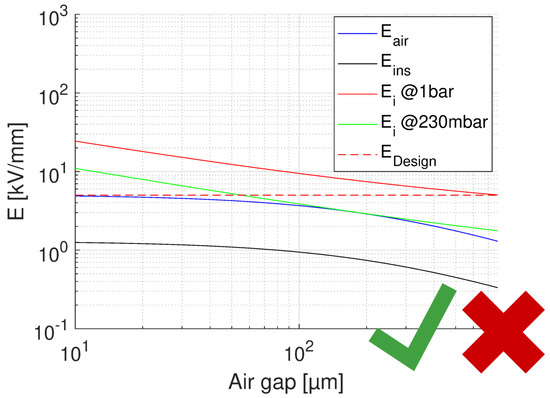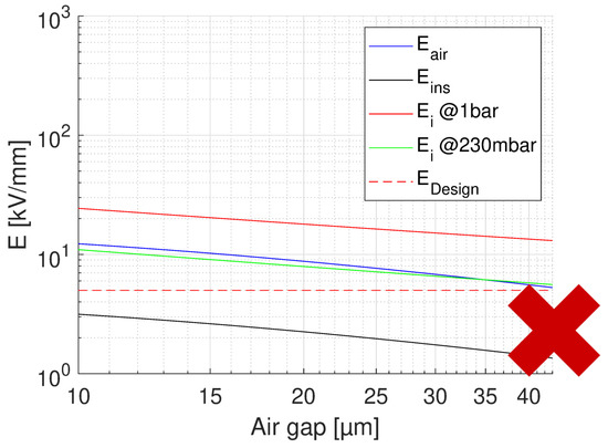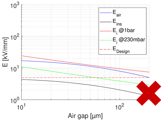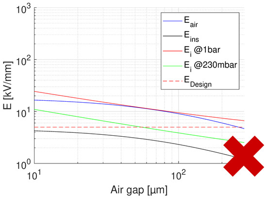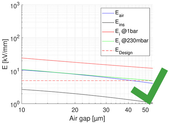 Feasibility plot for the optimum design of slot insulation, with the highest design field (5 kV/mm), and thinnest insulation (H2 = 200 m). Nominal operating voltage 1000 V (Figure 2, Table 1). The x axis reports the air gap thickness. No PD will be incepted in cavities of any size at ground pressure, but PD will likely incept for cavities ≥10 m at 250 mbar (35,000 ft).