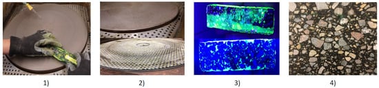 Using specially adapted preparation techniques for asphalt, sections are made from drill cores or laboratory specimens (e.g., Marshall specimens, plates from the rolling sector compactor). The sections should have a width of 100 to 150 mm to provide a representative sample of the structure. A saw with diamond-tipped blades is used to prepare the sections from the test specimens. During the cutting process, water is used as a cooling agent, as the binder in particular, tends to soften during cutting and can thus smear—filling air voids. After cutting, the specimen has to be dried. After drying the air voids are filled by vacuum impregnation with colored and fluorescent epoxy resin. The step is carried out in a vacuum chamber at a minimum pressure of 3 kPa. Any excess epoxy resin is polished off after complete curing (Figure 2), so that the epoxy resin is only present in the filled cavities.