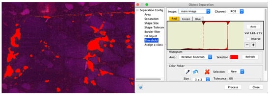 The prepared surface of the polished sections is recorded as a UV scan by a flat board scanner. The generated UV scan is then analyzed with the JMicroVison software (Freeware, Version 1.3.3). The color values are assigned to the pixels; the threshold values set should distinguish between air voids, aggregate, and binder (Figure 3). After adjusting the threshold values, various algorithms are used to extract the individual objects from the entire object. Using digital image processing, all individual cavities are captured and stored in tabular form.