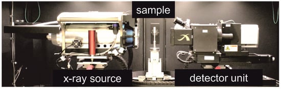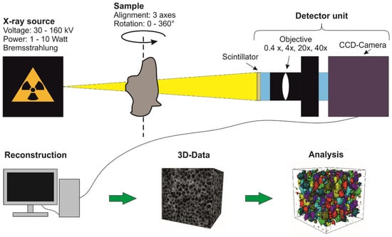 For the measurements, a high-resolution computer tomograph (µ-CT; see Figure 4 for functional principle) type Xradia 520 Versa, Carl Zeiss Microscopy GmbH (Oberkochen, Germany), was used, which has a spatial resolution of ≥0.7 µm. The measuring unit is shown in Figure 5. The X-ray source can be operated with a voltage between 30 and 160 kV at a power of 1 to 10 watts. With a total of 12 filters (6 low-emission and 6 high-emission filters), the X-ray beam can be adapted to the sample properties. A surface detector (magnification factor 0.4×) or three different objectives (4×, 20× and 40×) with scintillators can be used for signal detection. The sample stage can be moved on all three axes so that the region of interest (ROI) of the sample can be targeted. The reconstruction of the acquired projections is then performed automatically or manually with the XMReconstructor software (Zeiss Microscopy GmbH, Oberkochen, Germany, Version 11.1.8043.19515).