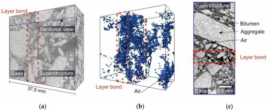 Many scientific questions about the material behavior of building materials can be answered by imaging methods in addition to the mechanical test methods. The material behavior of asphalt depends on the interaction between the constituents of the aggregate, the binder, and the air voids. In general, asphalt constructions are paved in several layers. Therefore, the interaction of the materials at the boundaries of the asphalt layers is particularly important so that any occurring stresses can be dissipated and do not lead to damage in the asphalt system. The effect of the layer bond depends on the interlocking of the aggregates, the bonding of the binder [], and the friction between the aggregates [,] of the two layers. The factors of bonding, interlocking, and friction depend to varying degrees on the asphalt characteristics, the surface condition, the paving conditions, and the traffic load [].