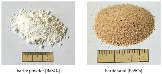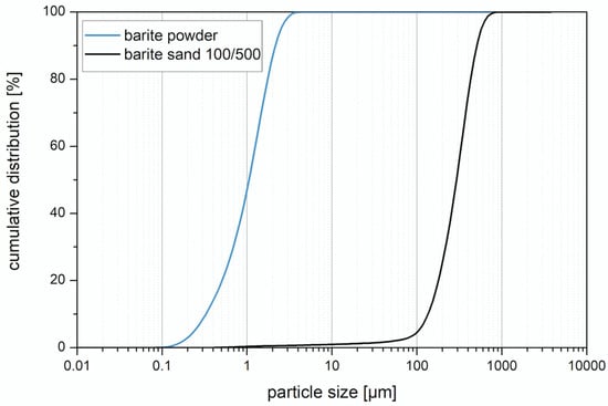 The particle size distribution of the barite powder and barite sand (Figure 8) was measured by using a laser granulometer LS 13 320 XR from Beckman Coulter GmbH (Brea, CA, USA) using the wet mode with distilled water. The result was evaluated according to the Mie theory. The differences in particle size distribution can be seen in Figure 9. The barite sand has a significantly coarser particle size distribution compared to the barite powder.