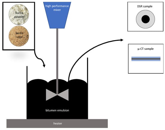 To determine the suitability of barite as powder and as sand, the influence on the change of the binder properties was determined on the one hand and the visibility in the µ-CT on the other. For this purpose, the two tracers were added using a high-performance mixer (see Figure 10). The addition of the individual amounts of tracer (see Table 3) was carried out at a speed of 700 rpm. This ensured that the tracer was evenly distributed in the emulsion and that no agglomerates formed.