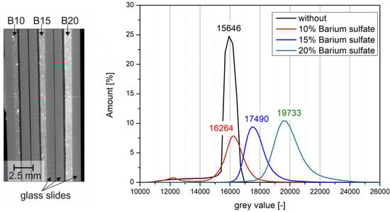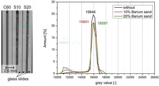 Cross-section through the CT scan of the bitumen samples with 10 wt%, 15 wt%, and 20 wt% barite powder (left) and evaluation of the gray scale histograms for the different dosages (right).