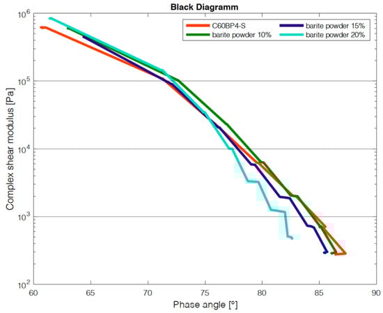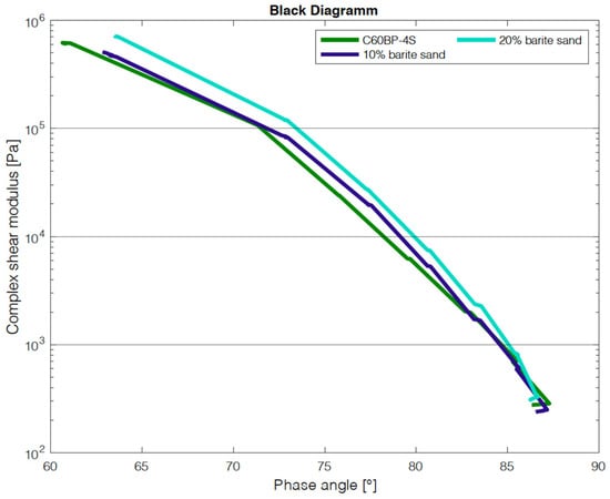 The results of adding barite sand are shown in Figure 15. It is striking that the addition of barite sand does not cause a great change compared to the addition of barite powder. At a small phase angle, the sample with 20 wt% barite sand has a higher shear modulus, but this equalizes again in the course of the test.