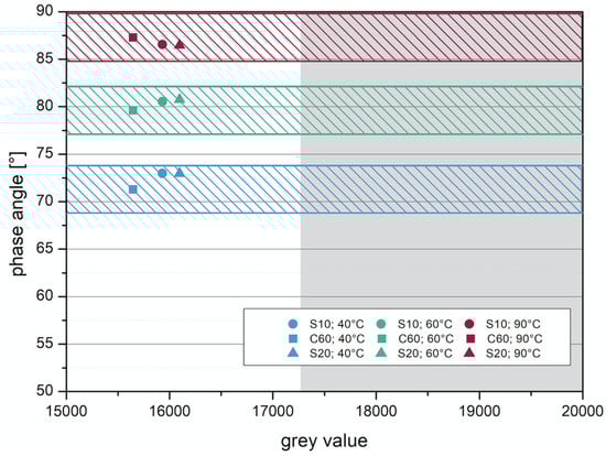 The use of barite powder, on the other hand, has proven to be useful. Here, the segregation problems have not occurred because the barite powder is very finely milled. In addition, the added barite powder achieves significant changes in the gray value, resulting in a distinction between the materials in the imaging. In Figure 17, the phase angle is plotted against the gray value. It can be clearly seen that the addition values of 15 and 20 wt% exceed the required gray value of 17,250. It is also clear from the figure that the phase angle decreases with the addition of 20 wt%.