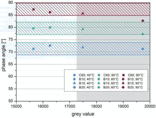 The addition of barite as tracer in the form of coarse-grained sand proved to be unsuitable for the observation with µ-CT. Although the investigations with DSR have shown that the changes in the properties due to the addition are only slight, the gray value, which is important for the evaluation of the µ-CT measurements, changes only very slightly. In Figure 16, the gray values are compared with the phase angle. It can be clearly seen that the addition of barite as sand has no great influence on the change in the required gray value. For a distinction, the gray value for the bitumen emulsion would have to be at least 17,250. Besides the ranges of the gray value, the changes of the properties should remain low, for this reason the colored ranges are shown. Inside these ranges, a property change is considered acceptable.