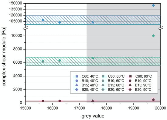 It can also be seen in Figure 18, where the complex shear modulus is compared with the gray value. With an addition of 20 wt% barite powder, the complex shear modulus increases significantly compared to the addition of 10 and 15 wt% as well as the reference material, which can be interpreted as a stiffening of the material. The value at an addition of 20 wt% is outside the tolerance range, which was defined (colored shaded area).