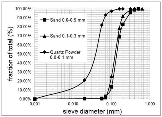 The influence of the above-mentioned polymer modifiers on the properties of waterproofing mortars was examined using CEM I 42.5 R Portland cement according to PN-EN 197-1:2012 []. The properties of the cement are presented in Table 1 and Table 2. The mortars also contain CL 90-S hydrated lime according to PN-EN 459-1:2015-06 []. The aggregates that were used are: quartz sand with a grain size of 0.0–0.5 mm, sand with a grain size of 0.1–0.3 mm and quartz powder with a grain size of 0.0–0.1 mm. The size distribution of the aggregates is presented in Figure 1. In order to give the mortars the appropriate consistency, flow, and to reduce runoff from vertical surfaces and ensure water retention, as well as to eliminate air voids from the structure, a cellulose thickener—hydroxyethyl methylcellulose with a viscosity of 25,000–35,000 cps (2% solution tested at 20 °C using a Brookfield viscosity gauge)—was used together with starch ether, which had a viscosity of 15 mPas (2% solution tested at 20 °C using a Höpler viscosity gauge). In order to increase the tensile strength and improve flexibility, FPE polyethylene fibres with a length of 200–500 µm and a diameter of approx. 10 µm, containing a PVA-wetting agent (approx. 1% m/m), and cellulose fibres with a length of up to 400 µm and a diameter of up to 45 µm were added. The addition of fibres also allows for the creation of a spatial skeleton, allowing the mortar to seal small scratches in the substrate.