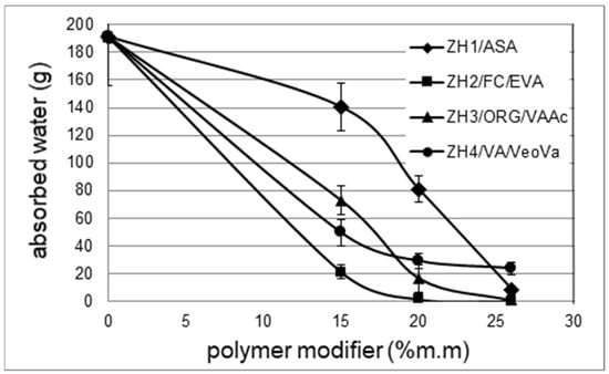 Clearly different results were obtained for the ZH1/ASA polymer modifier that was used in the form of an aqueous dispersion. It can be seen (Figure 2) that its positive effect on watertightness is evident only at 26% m/m of the polymer. In view of the above, the influence of the amount of cement on the water permeability of the mortar with the ZH1/ASA modifier was analysed. The results are presented in Figure 3. No clear influence of the amount of cement on the amount of absorbed water was observed.