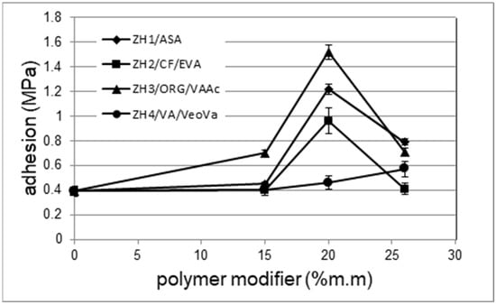 The effect of the ZH4/VA/VeoVa polymer was different. With the increase in the amount of ZH4/VA/VeoVa, the adhesion of the mortar increased uniformly to 0.55 MPa and it was much lower at 20% m/m than for mortars containing the other modifiers. At 26% m/m, the adhesion only reached 0.6 MPa (Figure 4).