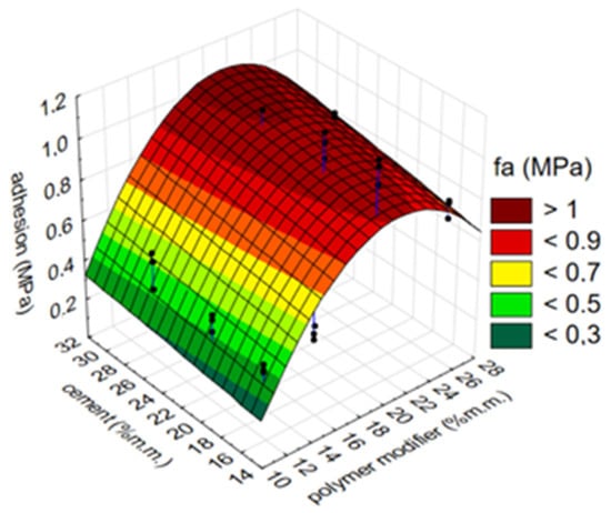 The effect of the simultaneous change in the amount of modifier and cement (% m/m) on the adhesion of the mortar (MPa) is presented in the example of the waterproofing mortar containing the ZH1/ASA polymer modifier. The results are presented in Figure 5. The graph has a clear inflection at the point where the modifier amount is 20% m/m. At 33% m/m of cement, the adhesion of the mortar is 1.2 MPa. It can also be stated that the content of the polymer modifier in the composition of the mortar has a greater influence on the adhesion than the content of the cement. A slight change in adhesion (MPa) of approximately 0.2 MPa was observed for a wide range of changes in the amount of cement, from 15 to 33% m/m, at constant amounts of polymer, while the adhesion changed by 0.8 MPa when the amount of modifier was changed from 11% m/m to 20% m/m. A well-known relationship is also the fact that too much cement increases the shrinkage of the mortar. This is disadvantageous in terms of both adhesion and watertightness.