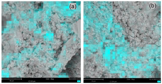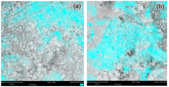 The microstructures of the mortars that were modified with ZH1/ASA, ZH2/CF/EVA and ZH3/ORG/VAAc were similar. Figure 6a shows the surface view of the mortar containing the ZH1/ASA polymer modifier in the amount of 15% m/m. Figure 6b shows the view of the mortar surface and the places where the presence of the polymer modifier was identified. In Figure 7, the surface views of the samples that were modified with the ZH3/ORG/VAAc in the amounts of 15% m/m (Figure 7a) and 20% m/m (Figure 7b) are compared. The samples were taken from the outer surface on which the areas of polymer-modifier occurrence were marked. After analysing the mapping results, it was found that the inter-grain space was filled with a cement-polymer paste with a homogeneous microstructure. Apart from the polymer, the paste featured evenly distributed hydrates and fine aggregates. Similar results were obtained for the samples taken from the inner parts of the mortar samples.