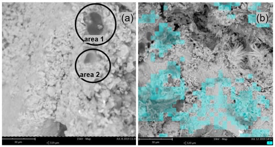 SEM photos of the mortar fracture taken from the inner part of the mortar sample modified with ZH4/VA/VeoVa in the amount of 20% m/m (a), where area 1 and area 2—pores with a circular cross-section filled with hardened polymer, (b) fragment with marked areas of polymer modifier occurrence obtained by mapping C atoms.