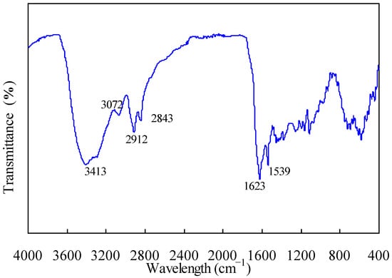 Figure 1 shows the FTIR identification of chemical groups involved for nylon-6 tennis filament waste, and these FTIR results for nylon-6 are almost the same as those documented in the literature [29,30]. The absorption band peaked at 3413 cm−1 can be attributed to the stretching vibrations of hydrogen-bonded NH groups while the adsorption bands centered at 3072, 2912, and 2843 cm−1 can be assigned to the stretching vibration of aliphatic CH groups for the nylon-6 waste sample. Meanwhile, the absorption peak at 1623 cm−1 can be accounted for as the stretching vibration of amide II and CN groups of nylon-6 and the one at 1539 cm−1 may be due to the vibrations of amide I [30]. The results indicate that the collected filament sample is primarily made of nylon-6 polymer.