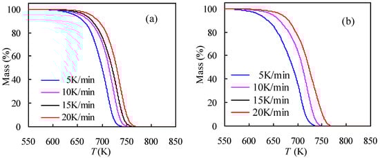 Figure 2 presents multi-heating-rate TG curves of tennis nylon-6 string waste samples determined in two different atmospheres of oxidative air and inert N2 and programmed from ambient to 850 K under four ramping rates of β = 5, 10, 15, and 20 K/min. Clearly, as found from the TG results, the mass-T curve has moved to higher temperature ranges upon enlarging the heating rate β and the temperature movement is applied to both cases. This result may be attributed to a combined effect of different heat transfer and distinct kinetic rates, which in turn, lead to the reduced gasification rate of the reaction product with the rise in heating rate and subsequently a temperature-shift compensation.