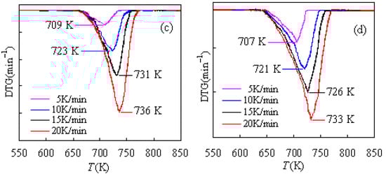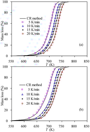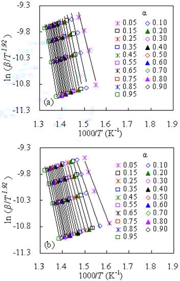 Currently, these integral methods have been extensively used to analyze non-isothermal TG data and then isoconversionally calculate activation energy at any arbitrary mass conversion level [11,21,22,23,24,25]. Using these methods, the left term is conveniently plotted against 1/T and a straight line will result for each conversion level, from whose slope the activation energy Ea can be easily evaluated over the whole conversion range. As such, these methods are thought of as model-free methods since they do not consider any specific chemical reaction model.