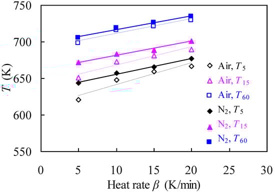 Looking at Figure 3 where some specific temperatures directly abstracted from TG data are plotted, one can see how the heating rate affects the thermal degradation of nylon-6 string waste. The temperatures randomly selected here include T5, T15, and T60, and they are defined as the temperatures, respectively, at 5% mass conversion (T5), 15% mass conversion (T15), and 60% mass conversion (T60). For both cases of inert and oxidative atmospheres, each of these specific temperatures is linearly promoted with the increase in the heating rate and a linear expression may be derived for quantitatively describing the heating-rate dependence of each specific temperature. As can be seen from Figure 3, under the same heating rate, these specific temperatures are all higher in inert nitrogen than in oxidative air. Similar observations have also been reported in our earlier work where an ionic liquid of [bmim]PF6 demonstrated rather better thermal stability in N2 than in air [25].