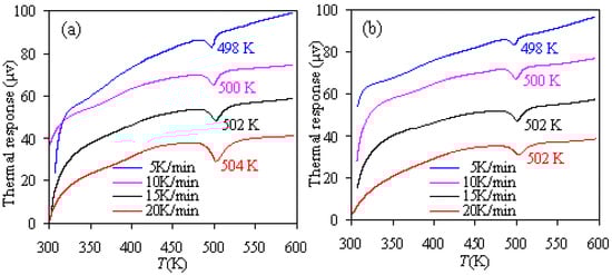 During pyrolysis, the nylon-6 tennis string waste sample experienced two heat response stages—endothermic melting and exothermic decomposition, respectively. Figure 4 presents the endothermic melting involved DTA curves under four different hearing rates for the nylon-6 waste. It can be seen that the nylon-6 possesses a crystalline structure and these crystalline properties are strongly impacted by the heating rate as evidenced by the variation in the melting point with the heating rate shown in Figure 4. In N2, the crystal in the nylon-5 waste sample melts at 498, 500, 502, and 504 K when heated at 5, 10, 15, and 20 K/min. In the case of air atmosphere, the melting points become relatively lower as compared to the inert case, similar to those TG data discussed above. These melting point values are consistent with those in the literature [31,32] and can be attributed to the presence of a thermodynamically stable α-form crystal of nylon-6, which is formed with hydrogen-bonded chains packed in an anti-parallel manner [31,32].