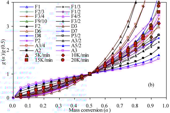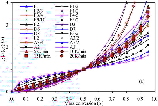 where x0.5 equals Ea/RT0.5 and T0.5 is a specific temperature set at α = 0.5. Based on Equations (5) and (11), a mathematical expression to represent the most common master-plots method [11,21,22,26], named the G-master-plots method for simplicity, can be deduced as follows: