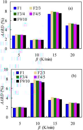 The AARD results under different β values for some reaction models with the CR method: (a) in nitrogen and (b) in air.