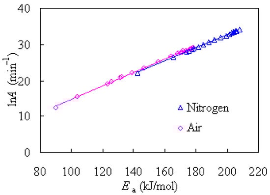 A further examination shows that there is a kinetic compensation effect between the Ea and lnA, indicative of a compensatory increase in lnA with an increase in Ea [23]. Such a compensation effect is graphically presented in Figure 8 and can be linearly expressed as the following: