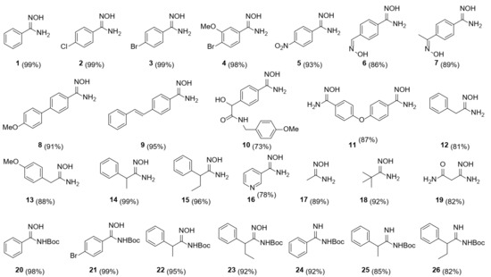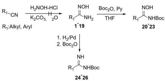 In our studies not only amidoximes and Boc-protected amidoximes were tested, but also Boc-derived amidines. Studied compounds are shown in Figure 2. The structures of all compounds were confirmed using NMR and mass spectroscopy. Melting points and spectral data of 1–26 remained in agreement with the literature data. The characterization data of the synthetized compounds 1–26 are presented in the experimental part.
