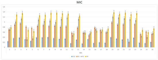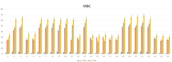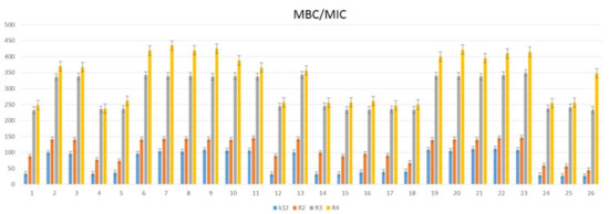 Minimum inhibitory concentration (MIC) of the amidoximes in model bacterial strains. The x-axis features amidoxime derivatives 1–26 used sequentially. The y-axis shows the MIC value in µg/mL−1. Investigated strains of E. coli K12 as control (blue), R2 strains (orange), R3 strain (grey), and R4 strain (yellow). The y-axis shows the MBC value in µg/mL−1. The order in which the compounds were applied to the plate are shown in Supplementary Materials Figure S1. Each experiment was performed independently in 3 replications (n = 3).