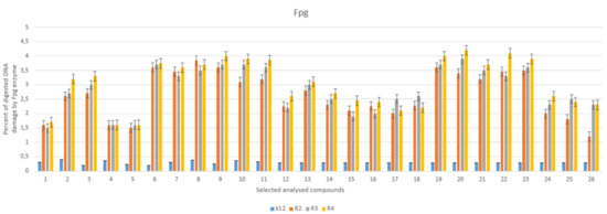Percentage of plasmid DNA recognized by Fpg enzyme (y-axis) with model bacterial, K12, and R2–R4 strains (x-axis). The compounds numbered 2, 3, 6, 7, 8, 9, 10, 11, 13, 19, 20, 21, 22, 23 were statistically significant at <0.05 * (see Table 1). Each experiment was performed independently in 3 replications (n = 3).