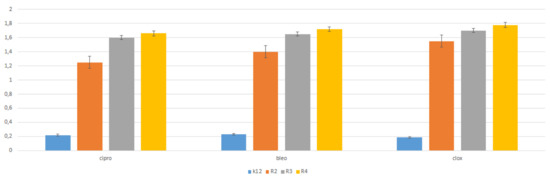 Examples of MIC with model bacterial strains K12, R2, R3, and R4 for studying antibiotics ciprofloxacin, bleomycin, and mechanism. The x-axis features antibiotics used sequentially. The y-axis features the MIC value in µg/mL−1. Each experiment was performed independently in 3 replications (n = 3).