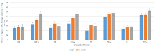 Percentage of bacterial DNA recognized by Fpg enzyme in model bacterial strains after ciprofloxacin, bleomycin, and cloxacillin treatment. The compounds were statistically significant at p < 0.05. Each experiment was performed independently in 3 replications (n = 3).